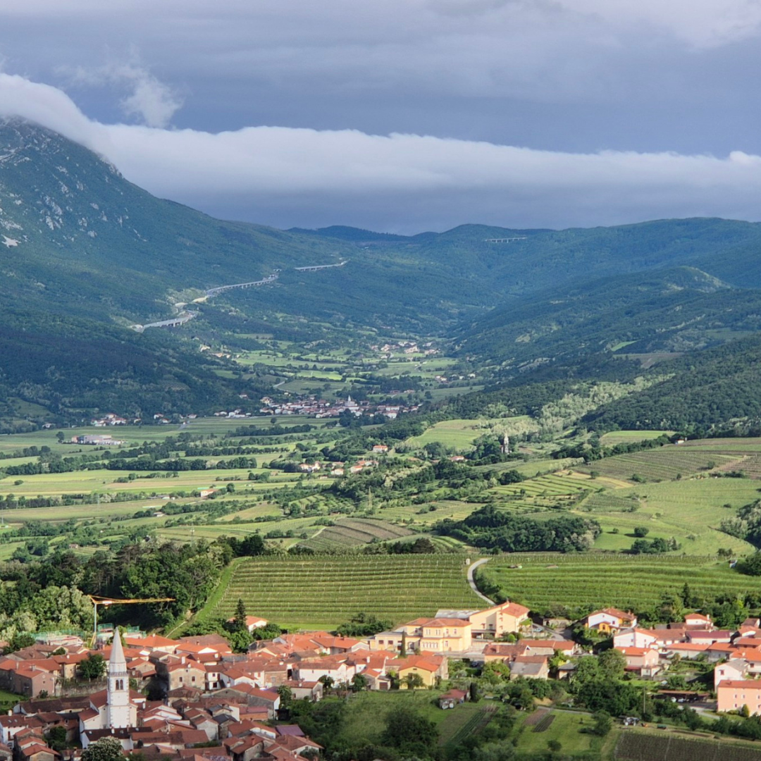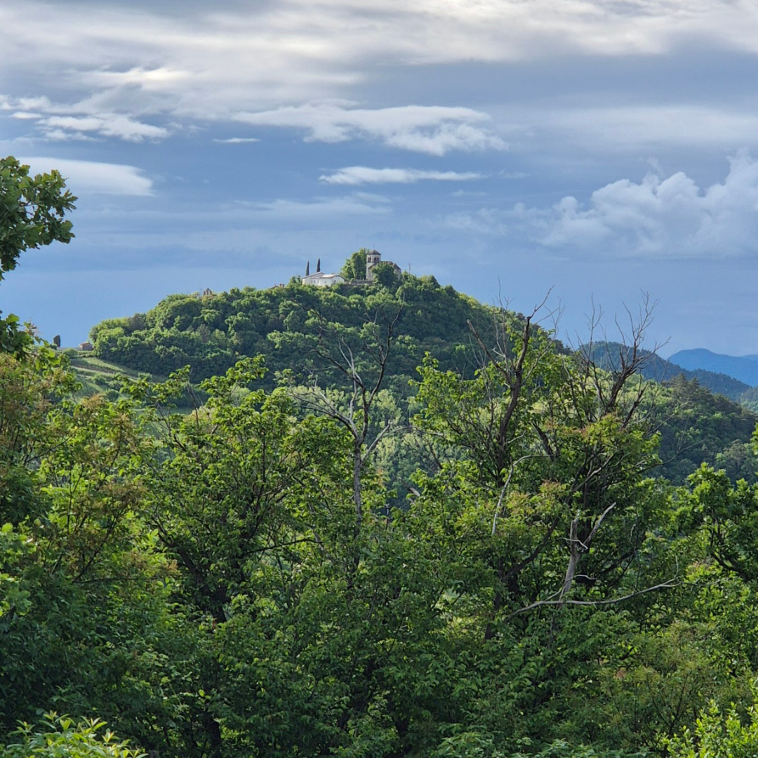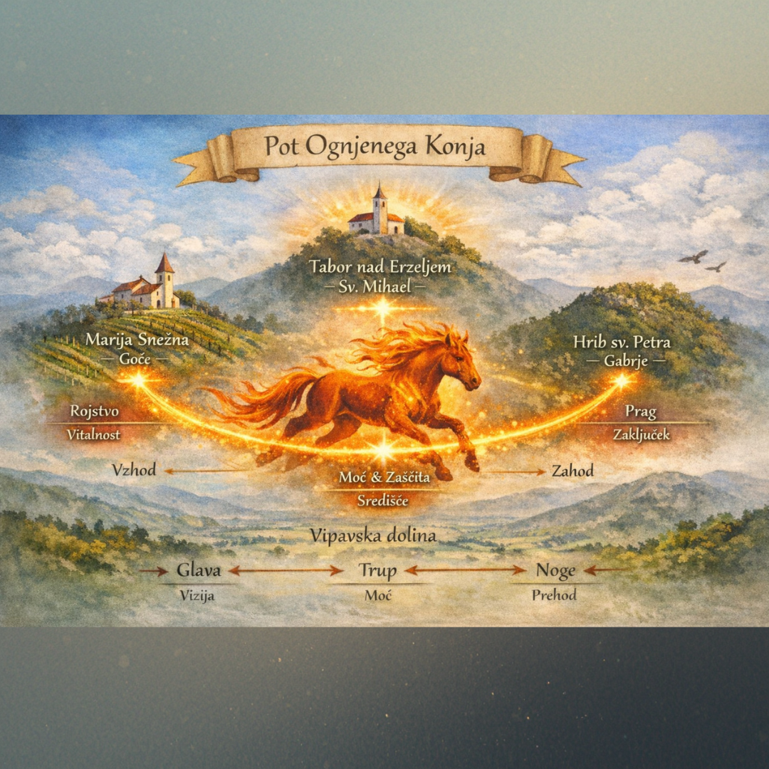 Od vasice se povzpnemo proti cerkvi Marije Snežne, ki stoji nad griči in razkriva čudovit razgled na Vipavsko dolino. To je srčni prostor kraja, kjer lahko začutimo močne, a nežne prepletajoče se vibracije – prostor miru, sprejemanja in notranje rasti. Cerkev je prvi hrib v energijski osi, ki ga bomo danes obiskali. Ime “Snežna” se verjetno povezuje s hribom, ki se imenuje Obelunc – ime izhaja iz staroslovanskega boga Belina, kar nakazuje čisto, belo energijo in prostor, ki prebudi notranjo jasnost. Tu se umirimo in prisluhnemo notranjemu Konju, arhetipu svobode, vitalnosti in življenjske energije, ki prebiva v nas. Cerkev Marije Snežne simbolizira maternico kraja in prostora, energijo rojstva ter spočetja novih idej, ki se v tem prostoru lahko razvijejo in začnejo uresničevati svojo obliko.