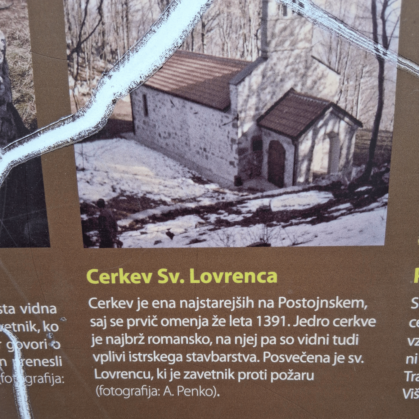 Na vrhu nas bo pričakala cerkev svetega Lovrenca, ki se prvič omenja leta 1391. Jedro naj bi bilo romansko, z vplivi istrskega stavbarstva. Romanska arhitektura je težka, prizemljena, tiha. Ne sili v višino, ampak se nasloni na zemljo. Takšne cerkve niso bile zgrajene, da bi človeka dvignile proč od sveta, temveč da bi ga umirile v njem.