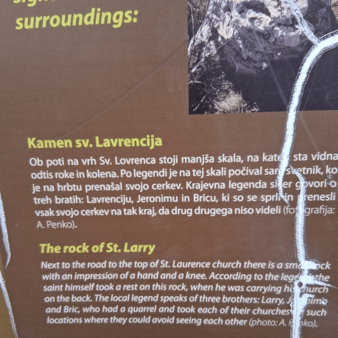 Gre za izročilo o Kamnu sv. Lovrenca ob poti pod vrhom, v katerem najdemo odtis roke in kolena. Pravijo, da je svetnik tu počival, ko je na hrbtu nosil svojo cerkev. Legenda govori o treh bratih, Lovrencu, Jeronimu in Bricu, ki so se razšli in vsak svojo cerkev odnesli daleč stran, da se ne bi mogli videti.