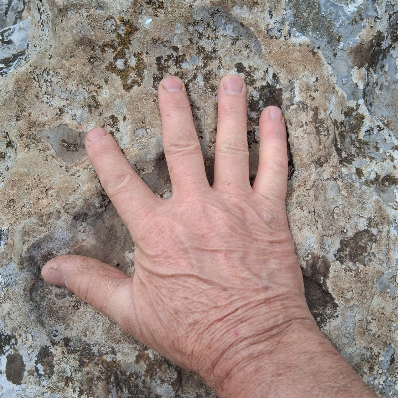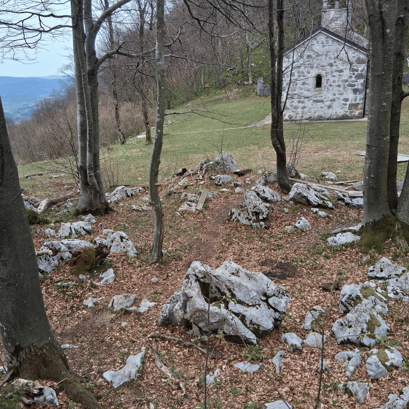 A to ni zgodba o nošenju stavbe, temveč o tem, da človek v sebi nosi svoj sveti prostor. In kamen ostaja kot priča. Odtis roke in kolena govori o trenutku, ko se človek nasloni na zemljo z vso svojo težo. Roka, ki daje, in koleno, ki se ukloni, se srečata v istem dihu predaje.